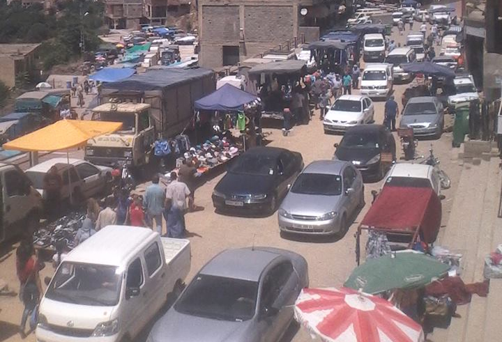 Les quelques tables de marchands de cigarettes et de cacahuètes, tolérées à une certaine époque, ont vite laissé place à des étals de plusieurs mètres débordant sur la chaussée. Les places réservées au stationnement sont occupées des deux côtés de la chaussée, ne laissant qu’un petit espace aux automobiles de passage qui arrivent difficilement à circuler entre les cageots de fruits et légumes et autres quincailleries.
